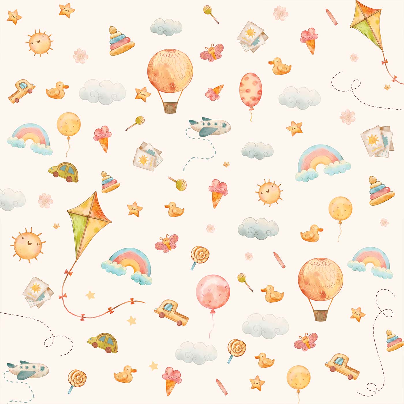 Add joy and color to your child’s world with this playful, fully customizable kids wallpaper! Featuring a delightful mix of rainbows, suns, stars, clouds, balloons, ducks, cars, ice cream, and more, this design creates a warm and happy setting—perfect for nurseries, playrooms, Montessori classrooms, playschools, and new baby room interiors.You can fully customise the colors, elements, or scale of the design to suit your space and style. Designed with flexibility in mind, this wallpaper grows with your child and fits beautifully into both girls room wallpaper and boys room wallpaper settings.The playful visuals help introduce young minds to shapes, colors, weather, and everyday objects, sparking early learning in a gentle, creative way, making education fun!Whether you’re decorating a nursery, a Montessori school wall, a playroom, or a cozy nook in a new baby room, this cheerful design adds just the right blend of fun, creativity, and comfort.