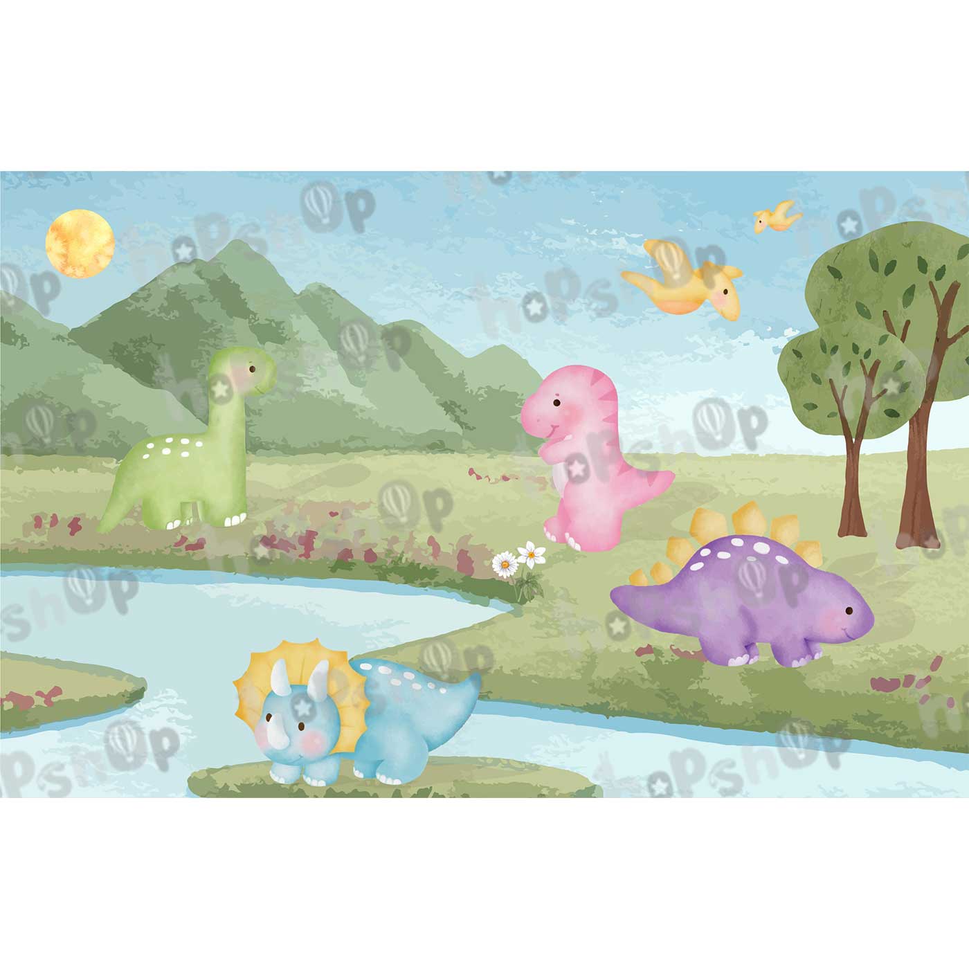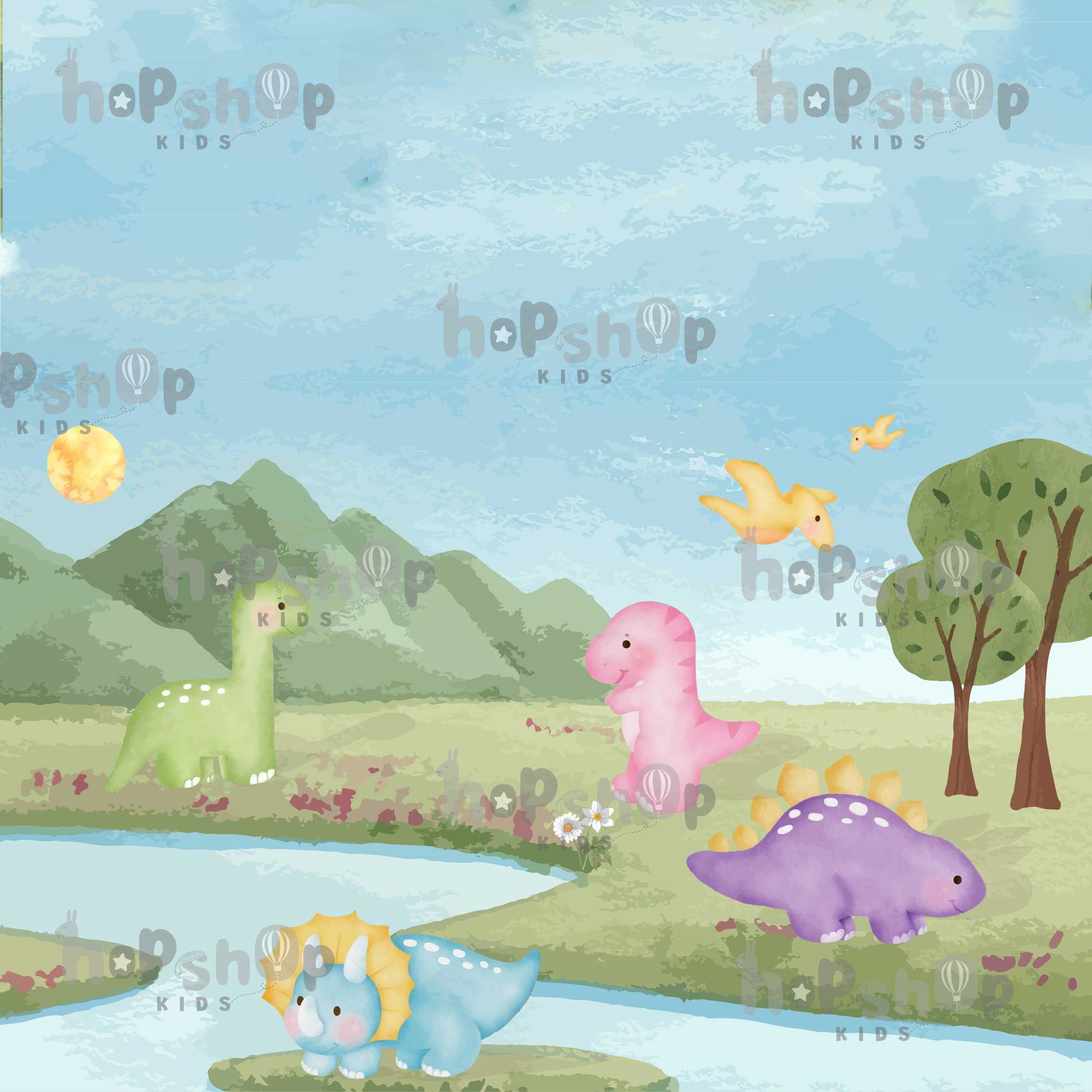 This fun dinosaur wallpaper is the perfect choice for nurseries, playrooms, Montessori school classrooms, and even new baby room interiors. Set in a colorful jungle with tall mountains, a flowing river, and beautiful flowers along the banks, it turns any child’s space into a fun and happy adventure. Designed to make kids smile, it sparks curiosity and adds a warm, welcoming feel.Whether you’re decorating a playschool wall, a girl’s room, a boy’s room, or creating a cozy corner for naps and play, this wallpaper brings just the right mix of excitement and calm.The design features friendly dinosaurs surrounded by nature—walking near rivers, peeking from behind trees, flying and enjoying the floral jungle. With bright, cheerful colors and details that make you and your little one  travel back in time, this wallpaper helps bring stories to life and makes everyday play more magical.