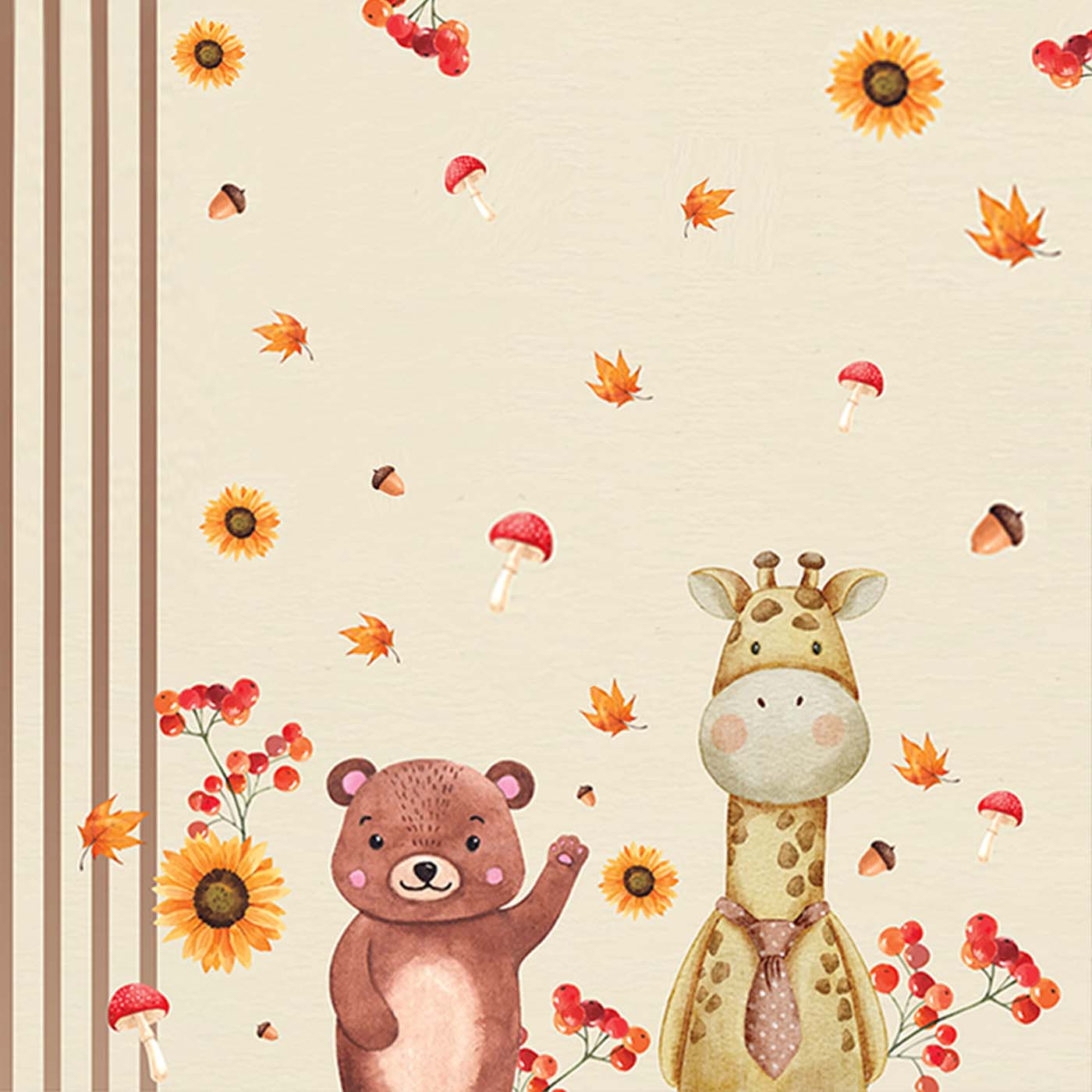 This cute kids wallpaper featuring a pastel bear and giraffe duo are dressed up and ready to play! Set against a soft beige background, the giraffe wears a playful tie while the cuddly bear adds magic and character. Surrounded by classy autumn leaves, florals, and bright cherries, this enchanted design creates a unique and stylish setting for any children’s room. Perfect for nurseries, playrooms, Montessori classrooms, playschools, or new baby room interiors, this modern design blends creativity, comfort, and imagination, making it a good choice for both girls room wallpaper and boys room wallpaper. This childrens wallpaper is fully customizable—adjust the colors, design elements, or scale to fit your space perfectly. Whether you’re designing a playroom or an educational wall, this pastel wallpaper adds colour and joy that’s timeless with your child.