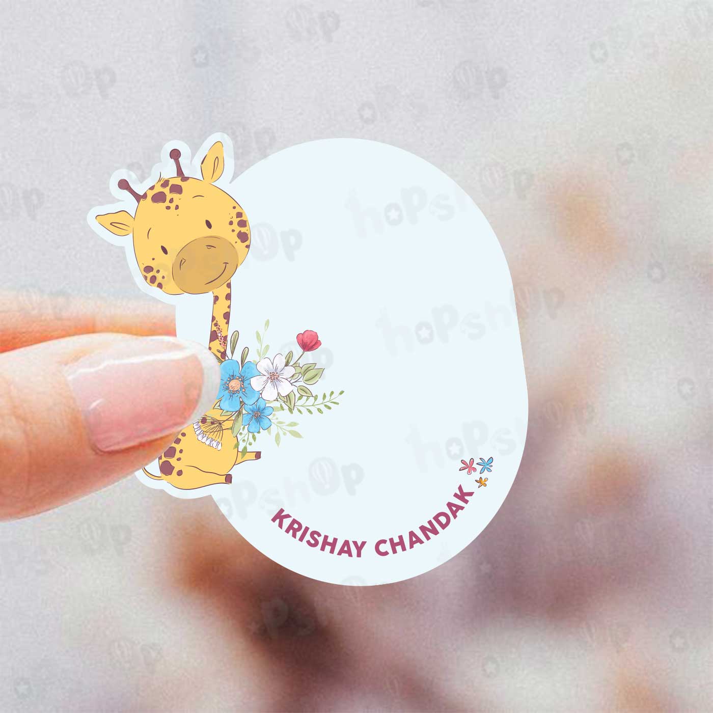 A set of 45 super cute giraffe inspired gift tags to elevate your child’s presents. A sandy coloured adorable baby giraffe with muddy prints is seen carrying blooming bright flowers looking up with hopeful eyes against a clear pastel blue backdrop. The giraffe is illustrated with watercolor strokes, and is carrying delicate fresh flowers looking at you with wonder filled eyes. The tag is in the shape of the illustration, roundish and comes without a punching hole so you may choose to stick it directly on your gift, should you want to punch a hole there is adequate space left to do so. The overall design is magical, evoking the charm of classic fairy tales while adding a mysterious, playful touch with your child’s name written in bold at the bottom adorned with tiny flowers. Get in touch to order personalised stationery for your little one!