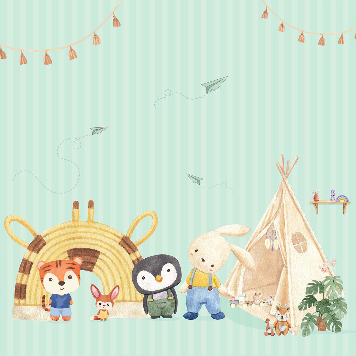 This cute kids wallpaper featuring Peter Rabbit and his sweet animal friends! Set against a soft pastel blue background, this adorable children’s wallpaper entails cute forest animals, magical toys, and gentle illustrations that bring warmth, joy, and imagination to your child’s space.Perfect for nurseries, playrooms, Montessori classrooms, playschools, or new baby room interiors, this playful wallpaper adds a storybook charm encouraging curiosity and creativity. Whether you’re designing a dreamy corner for quiet reading or a lively wall full of adventure, it’s an ideal choice for both girls room wallpaper and boys room wallpaper.Fully customisable—change the colors, characters, or scale to suit your style and room. Let your little one grow up surrounded by the magic of childhood tales and gentle design.