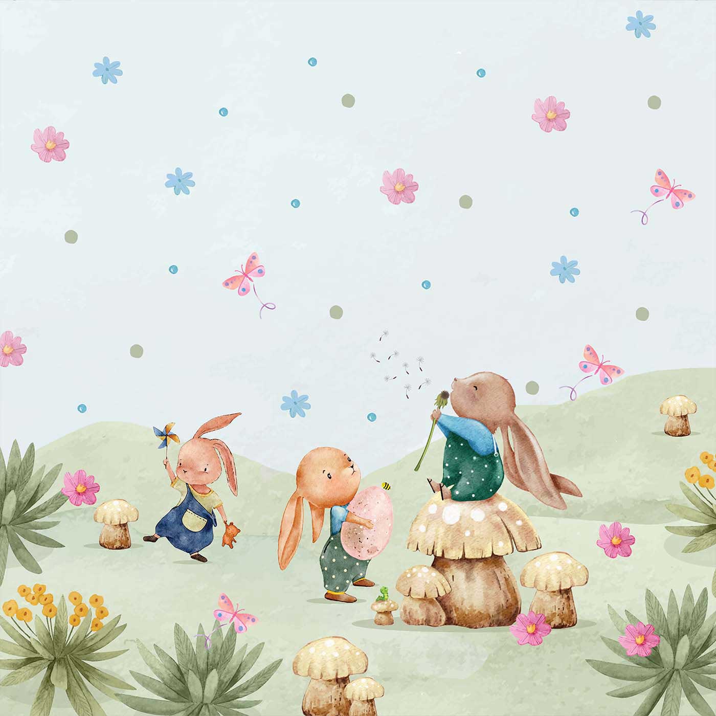 Turn your child’s room into a magical meadow with this cute kids wallpaper featuring three charming rabbits playing in an enchanted garden! One sweet bunny perches playfully on a mushroom while the others hop among blooming flowers and fluttering butterflies—all set in a lush, magical jungle filled with wonder and calm.The soft, storybook-style illustration and pastel tones create a peaceful, imaginative space that’s perfect for nurseries, playrooms, Montessori classrooms, playschools, and new baby room interiors. Ideal for both girls room wallpaper and boys room wallpaper, this delightful woodland design brings joy, nature, and a touch of fantasy to every corner.This wallpaper is fully customizable! Adjust the colors, layout, or scale of the design to suit your unique style and room size. Whether you’re decorating a cozy nursery nook or adding charm to an educational wall, this classic enchanting rabbit theme grows timelessly with your child.