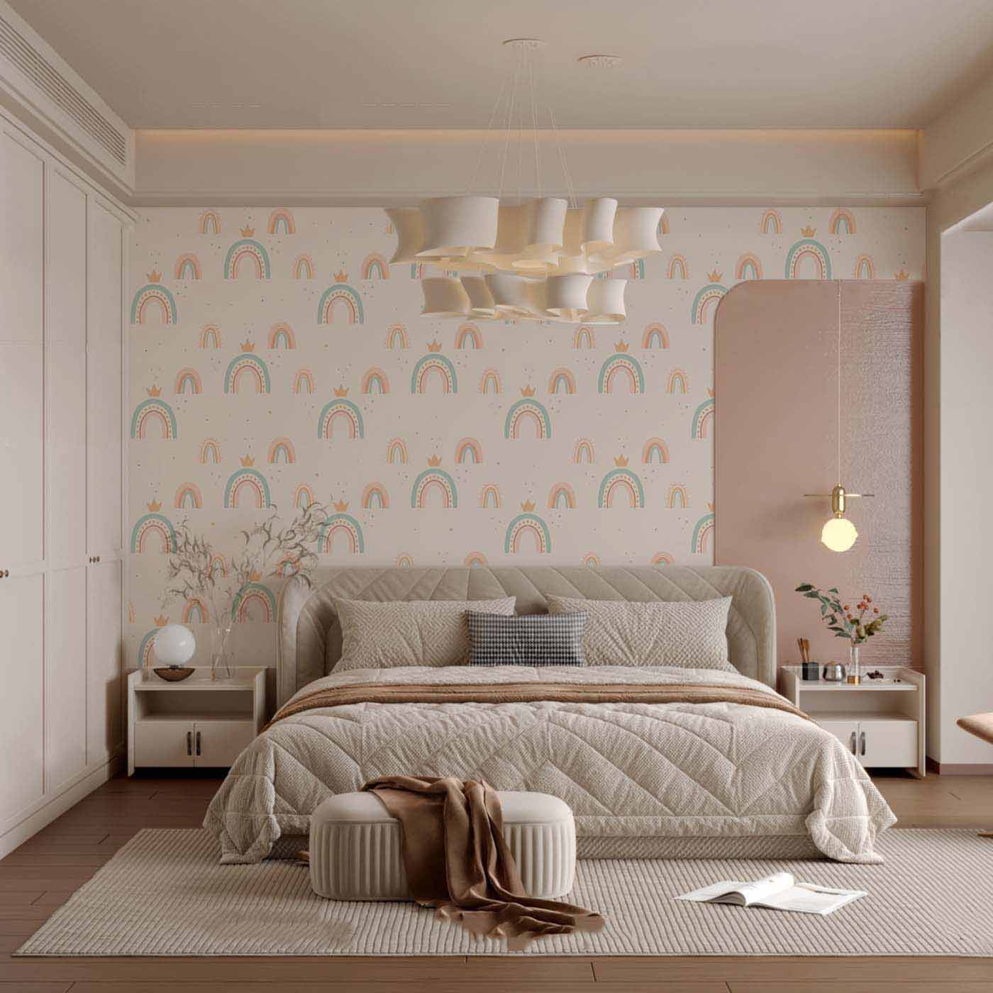 Fill your child’s space with magic and color with this adorable kids wallpaper featuring dreamy pastel rainbows! Set against a soft, soothing background, this design showcases fun, funky and unique rainbow patterns—some with sweet little crowns—bringing a touch of whimsy and sparkle to every corner. It’s perfect children’s wallpaper for creating a calming, cheerful atmosphere that children will love.Whether you’re designing a nursery, decorating a Montessori classroom, setting up a cozy playroom, or styling a new baby room interior, this wallpaper adds joy, softness, and imagination to any space. The gentle pastel tones and girly charm make it a favorite for girls room wallpaper.It’s fully customizable. You can tweak the colors, scale, or rainbow designs to match your space and theme perfectly—making this a wallpaper that grows with your child and fits beautifully in playschools, educational spaces, or at home.
